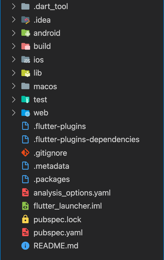 아래와 비슷한 파일 구조를 가진 플러터 앱이 생성됩니다.