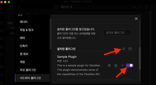 - 코드가 수정된 플러그인을 다시 로드하기 위해서, 옵시디언 "설정 > 서드파티 플러그인"에서 플러그인을 비활성화 했다가 다시 활성화합니다.