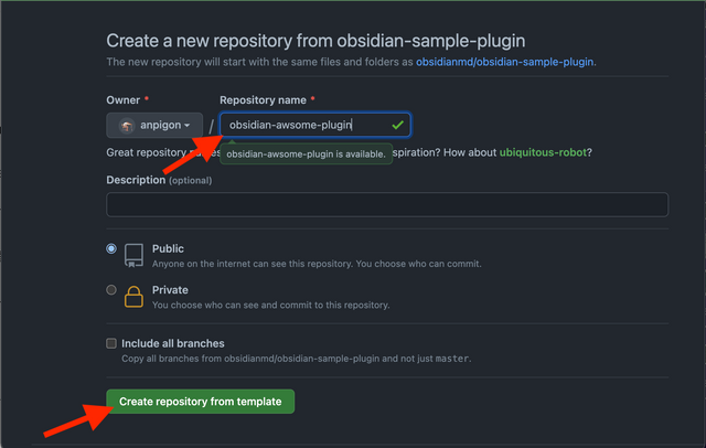 - Repository name에 옵시디언 플러그인 이름을 입력합니다. 옵시디언 플러그인은 보통 obsidian-로 시작합니다. 예를 들면 obsidian-awsome-plugin로 작성합니다.
