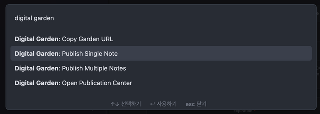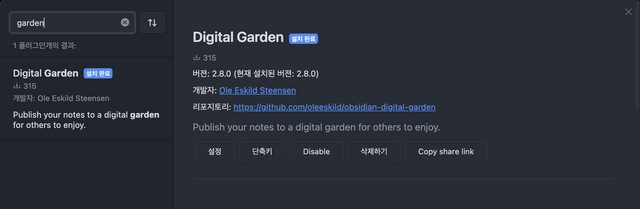 옵시디언에서 Digital Garden 플러그인 검색하고 설치합니다.