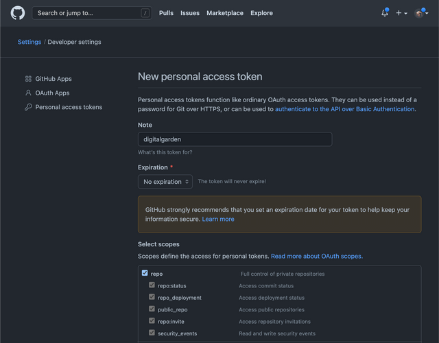 - Github repo name에 방금 생성한 리포지토리 이름(예. digitalgarden)을 입력합니다.
