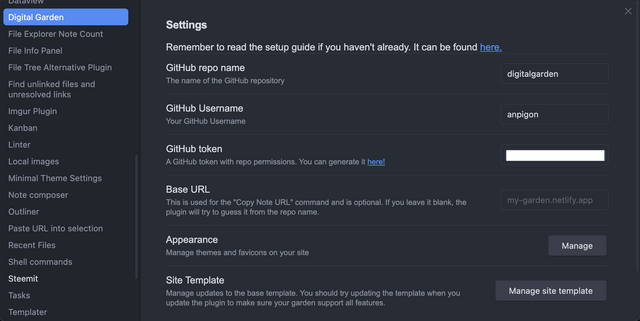 발급 받은 깃헙 액세스 토큰을 토큰을 복사하여, Digital Garden Settings를 다시 열고 토큰을 붙여넣습니다.