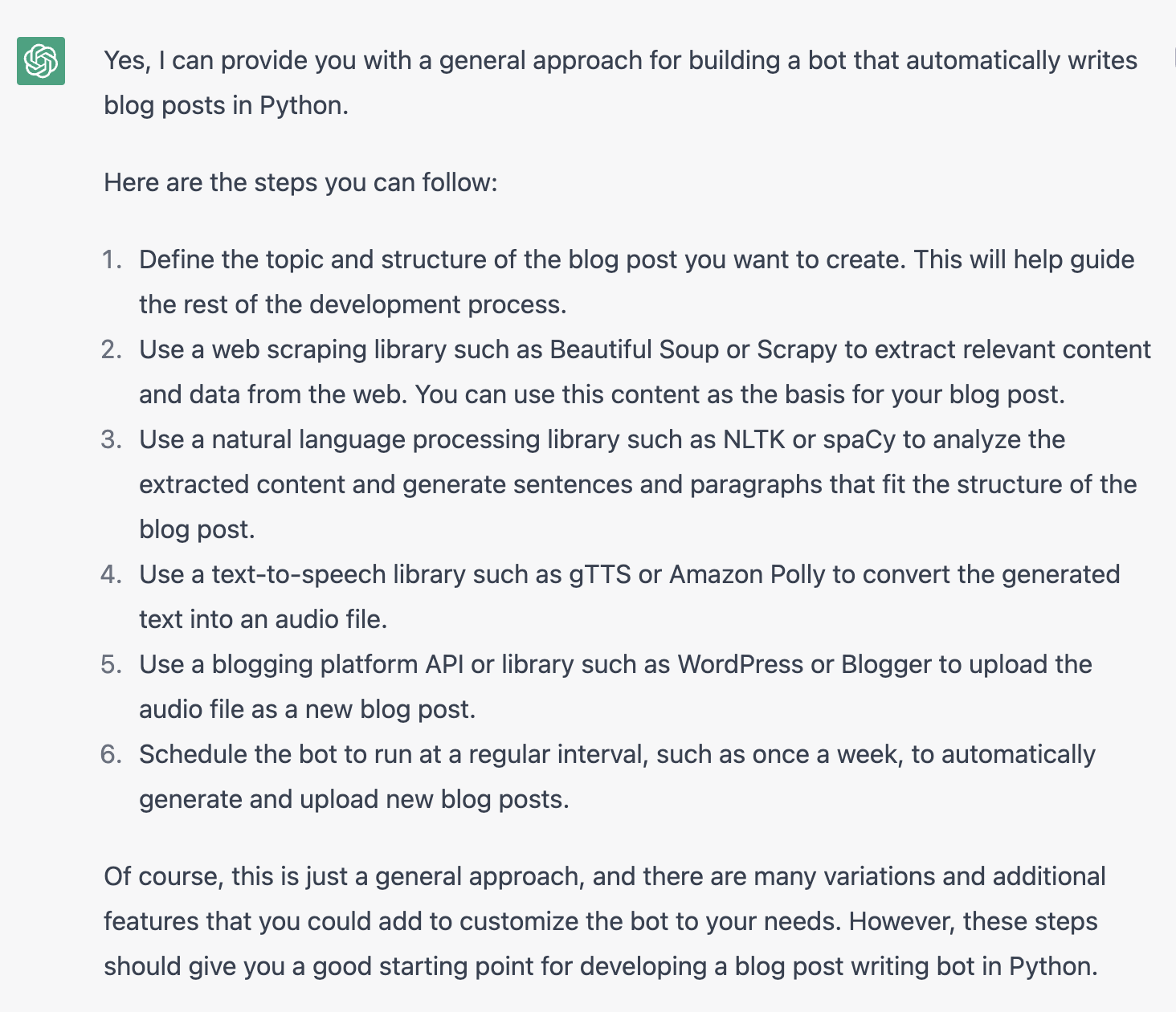 ChatGPT는 이것이 간단한 예시일 뿐이며 수정해서 사용하라고 했다. 그리고 이것은 파이썬으로 나만의 블로그 게시물 작성 봇을 구축하기 위한 출발점이 되기를 바란다고 전했다.