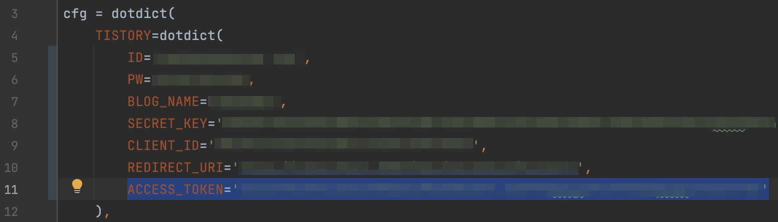 에서 xxx를 입력합니다. - SECRET_KEY, CLIENT_ID, REDIRECT_URI: Tistory API 등록 시 발급받은 값을 입력합니다.