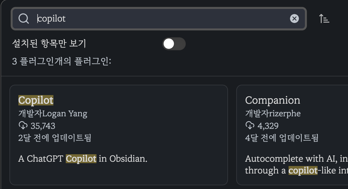 플러그인 설치 방법은 [설치 링크]를 클릭하여 설치하거나, 옵시디언 커뮤니티 플러그인에서 Copilot를 검색해서 설치합니다.
