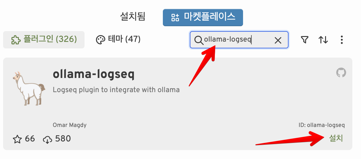 Logseq에서 Ollama를 사용하기 위해 첫 번째 단계는 플러그인의 설치입니다. Logseq 마켓플레이스에서 'ollama-logseq’를 검색하여 설치할 수 있습니다.