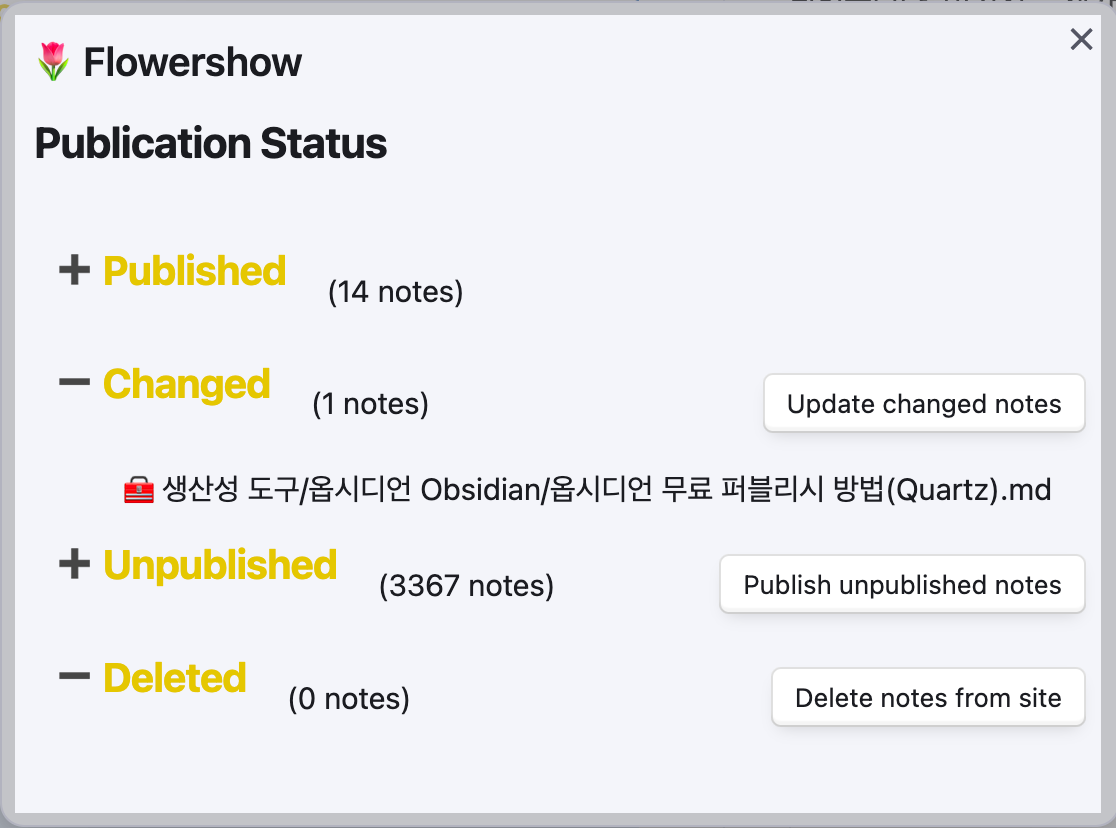 Flowershow 플러그인을 사용하여 노트를 업로드한 후에는 옵시디언에 추가된 리본 아이콘 🌱을 클릭하여, 업데이트된 노트를 다시 업로드하거나 삭제할 수 있습니다.