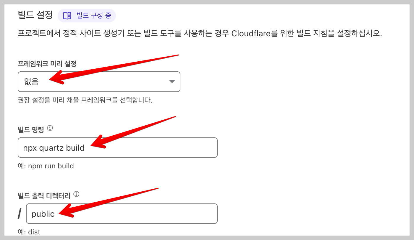 빌드 설정에서 '프레임워크 미리 설정’을 '없음’으로 설정하고, '빌드 명령’에는 npx quartz build를 입력합니다. 그리고 '빌드 출력 디렉토리’에는 public를 입력합니다.