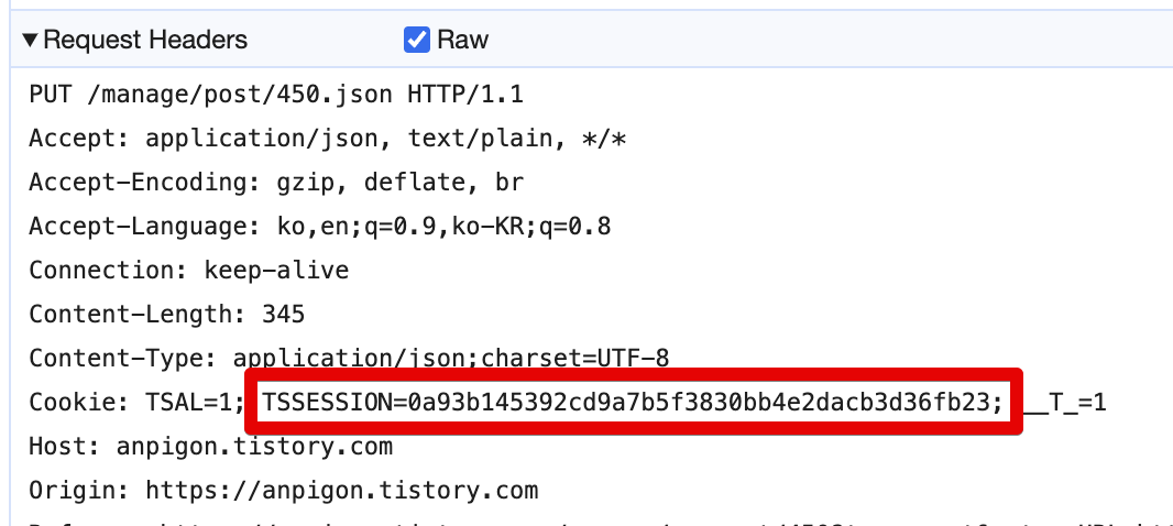 이에 따른 대안을 찾기 위해, 티스토리 웹의 연동 방식을 검토하였습니다. 그러나, 티스토리 웹은 JWT(액세스 토큰)가 아닌 브라우저 세션을 기반으로 동작하므로, 옵시디언 플러그인에 적용하기에는 어려움이 있었습니다.
