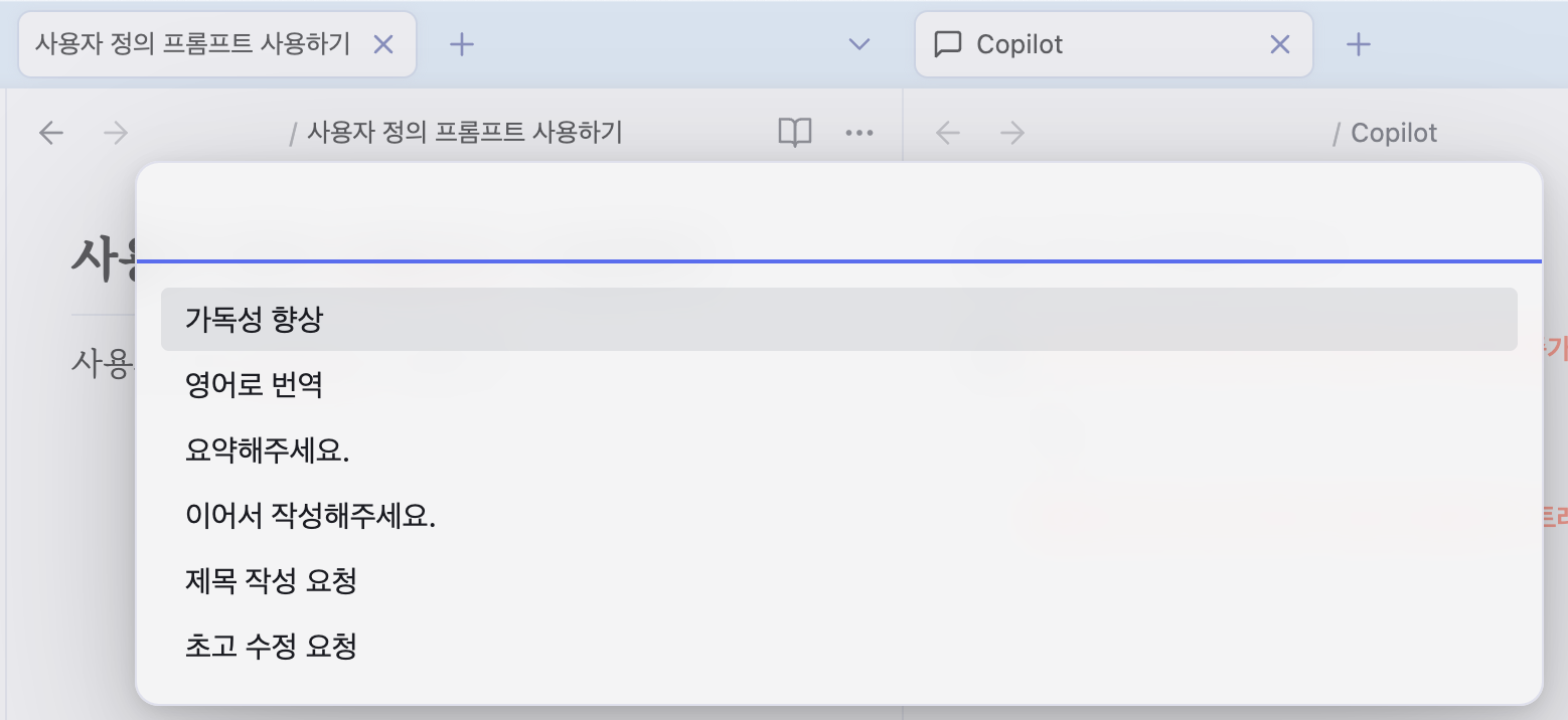 사용자가 사전에 입력해둔 프롬프트를 활용할 수 있습니다. 명령어 창에서 'Copilot: Apply custom prompt to selection'을 선택하세요. 그런 다음, 저장해 둔 프롬프트 중에서 원하는 것을 선택합니다.