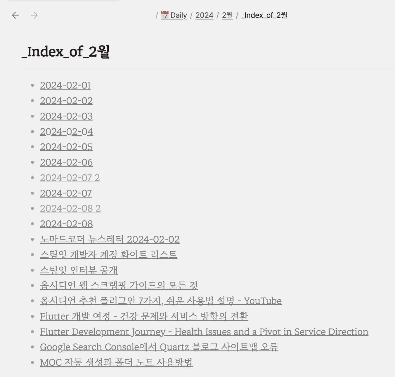 설정을 마친 후, 폴더를 클릭하면 아래 이미지와 같이 폴더에 포함된 노트들이 자동 링크로 작성된 인덱스 노트가 생성되어 나타납니다. 이를 통해 관련 노트를 빠르고 쉽게 찾아볼 수 있습니다.