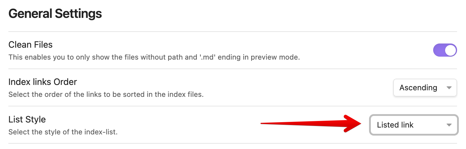 - List Style 옵션을 Listed link로 변경하여, 생성되는 MOC 페이지에서 노트 링크를 리스트 형식으로 표시하도록 설정합니다.