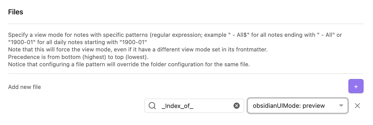 _Index_of_를 입력하고, obsidianUIMode 옵션을 preview로 선택하여,_Index_of_로 시작하는 모든 노트를 열었을 때 자동으로 읽기 모드로 전환되게 합니다.