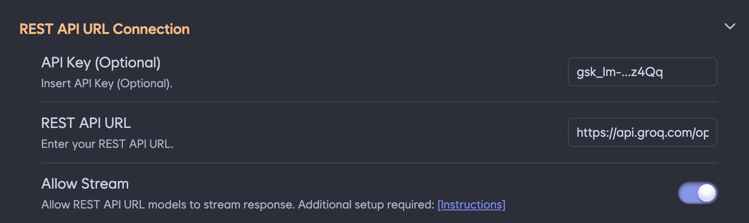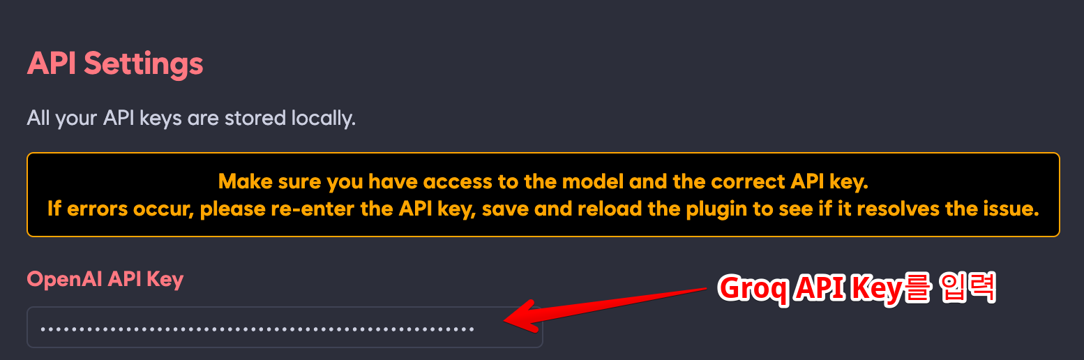 2. API Settings에서 OpenAI API Key에는 Groq에서 발급받은 키를 입력합니다.