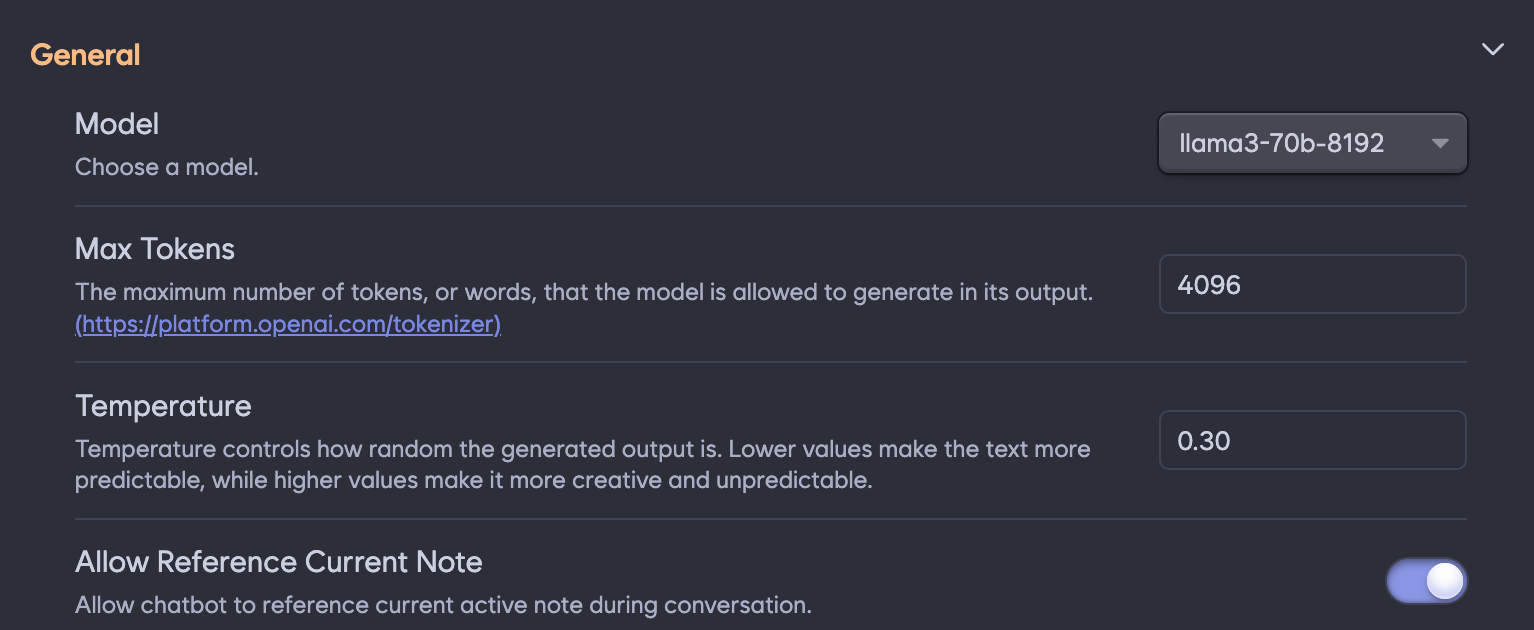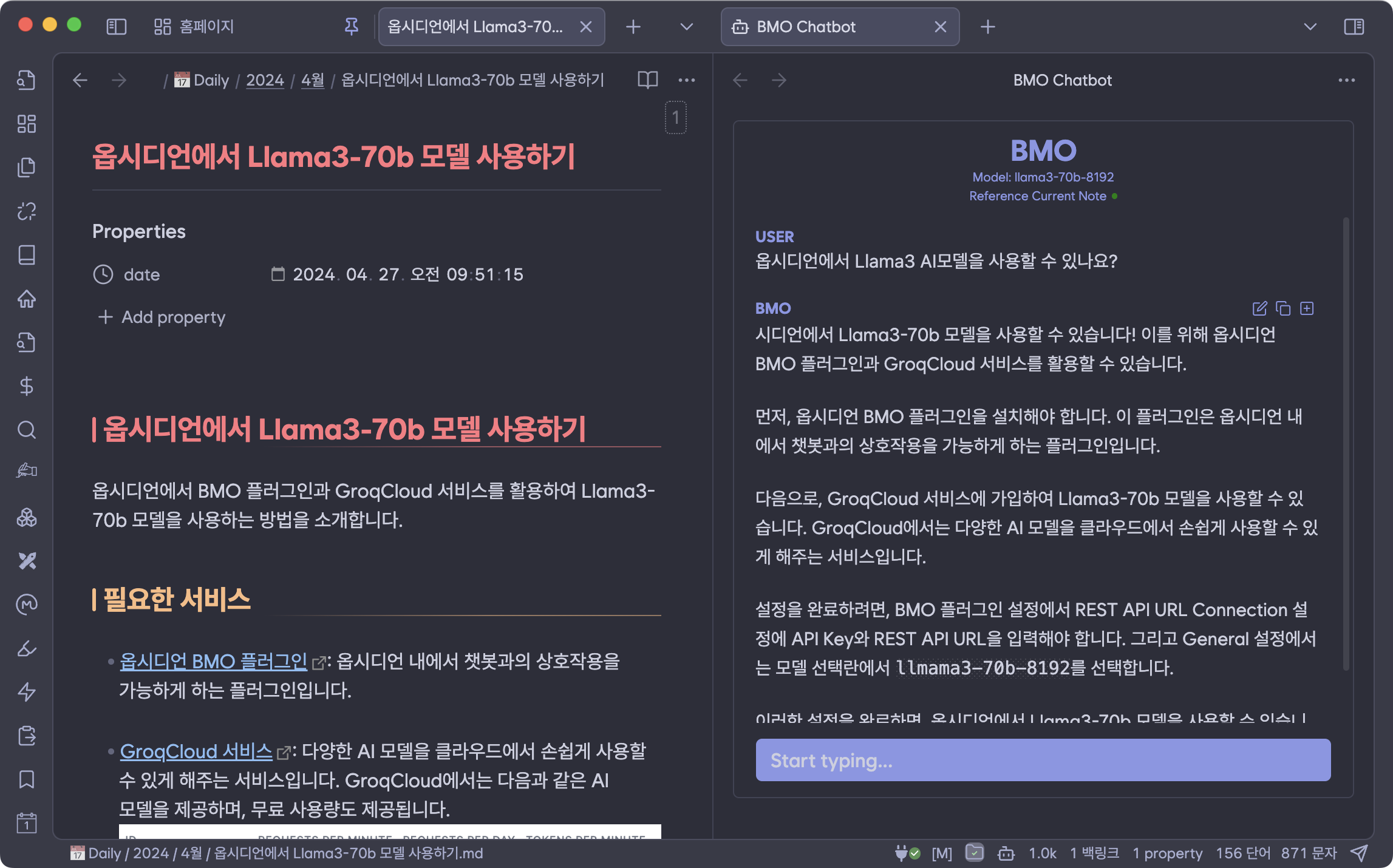 BMO 플러그인을 통해 옵시디언에서 Llama3-70b 모델을 사용하기 위한 설정 방법은 아래와 같습니다.