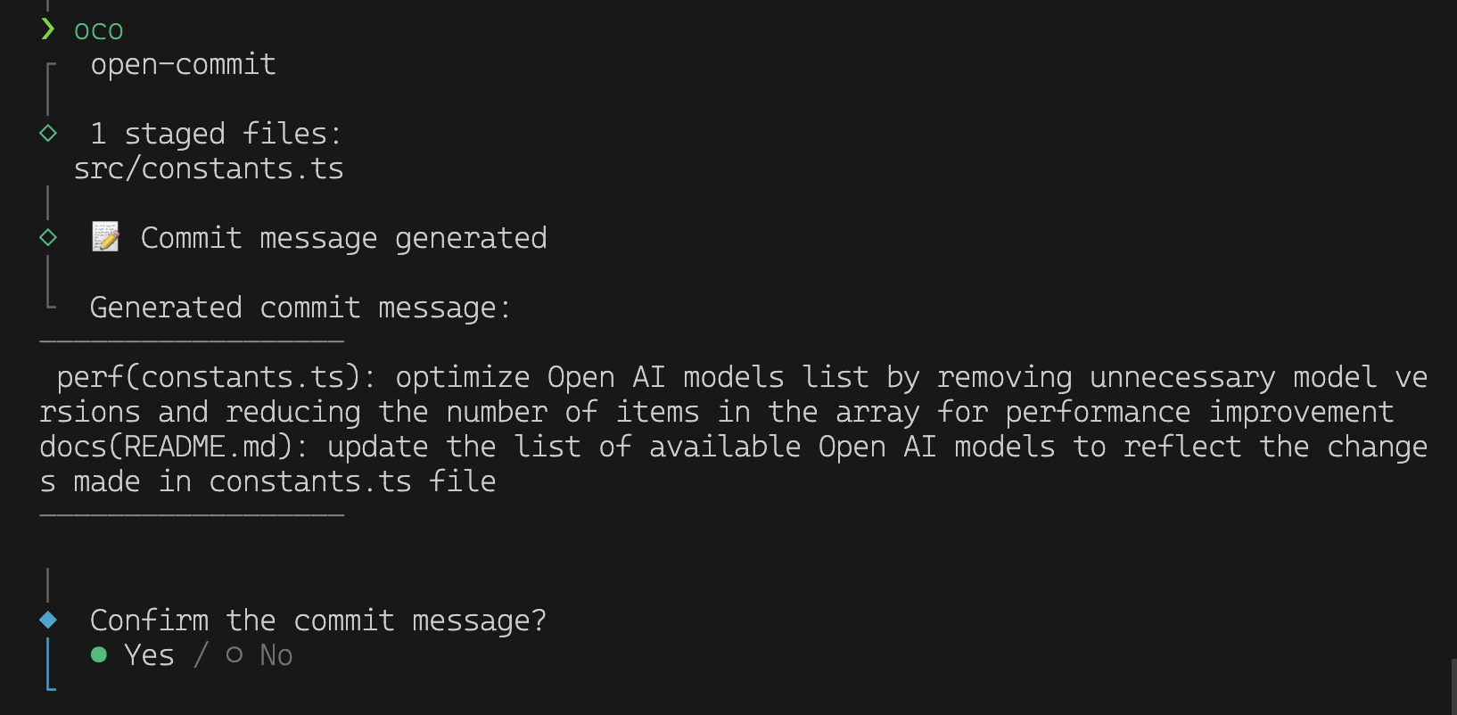 스테이징된 변경 사항에 대한 커밋 메시지를 생성하려면 git commit 대신 opencommit 명령어를 실행합니다.
