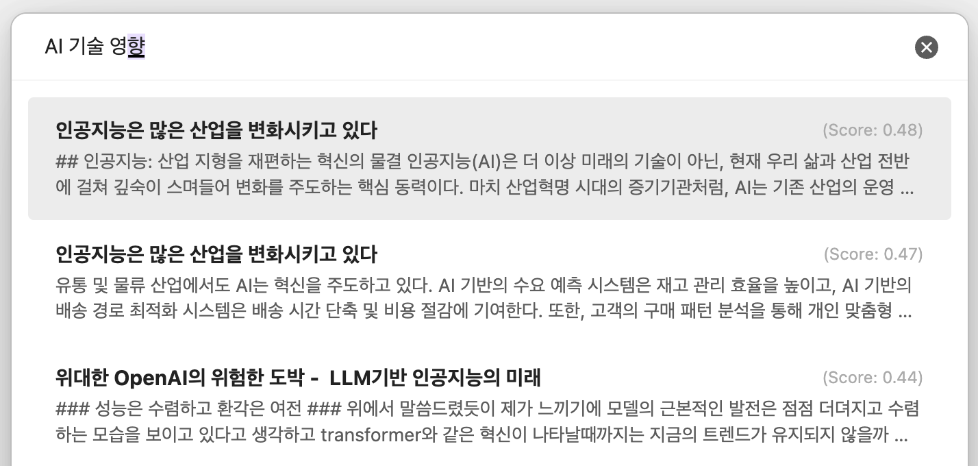 Omnisearch는 뛰어난 검색 성능을 제공하는 플러그인이지만, 정확한 키워드 매칭에 의존하는 특성상 유사 단어나 관련 개념을 포함한 문서를 찾는 데는 한계가 있습니다. 반면, 시맨틱 검색은 문장 간의 의미적 유사도를 분석하여 검색하므로, 키워드가 정확히 일치하지 않더라도 문맥상 연관된 문서들을 효과적으로 찾아낼 수 있습니다.