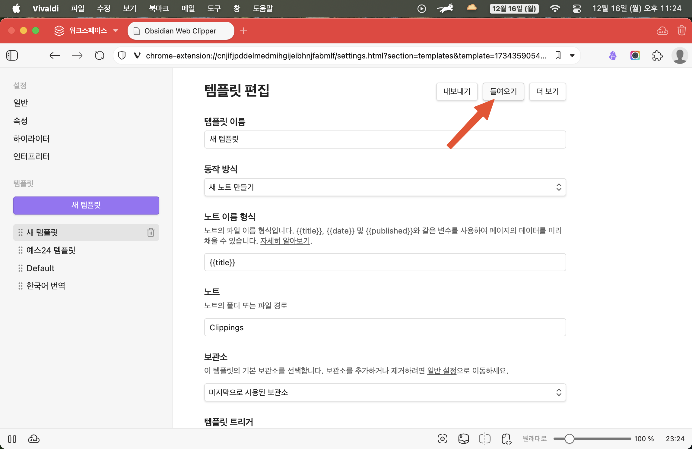 다운로드한 예스24-템플릿-clipper.json 파일을 선택하여 템플릿을 추가해 주세요.