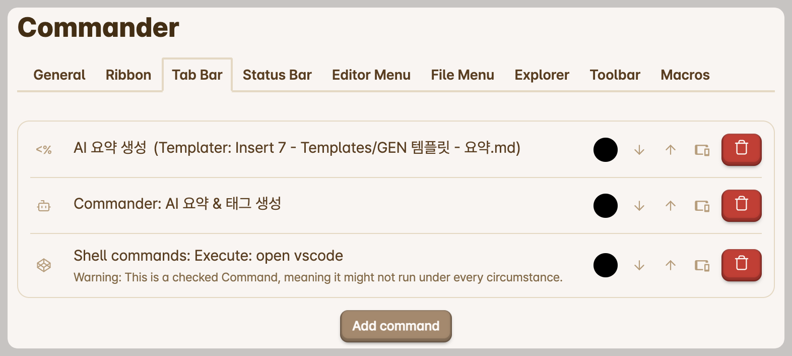 Commander는 사용자 인터페이스의 여러 부분에 명령을 추가하거나, 매크로를 생성할 수 있는 옵시디언 플러그인입니다.