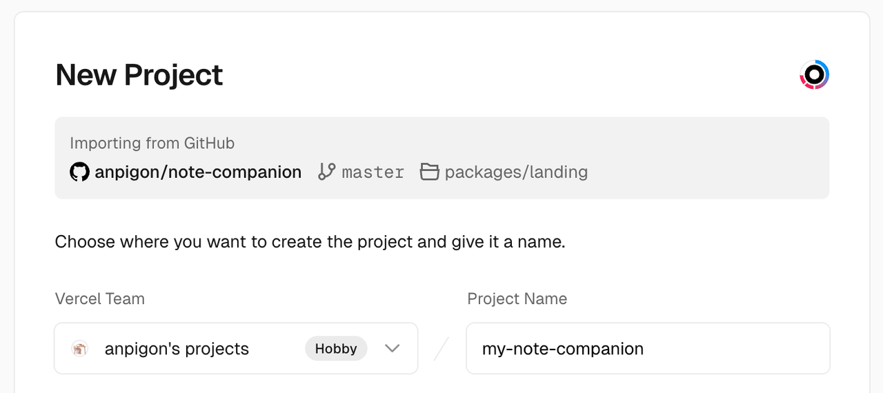 different-ai/note-companion 리포지토리를 본인의 GitHub에 포크한 후, Vercel에서 새 프로젝트를 생성합니다.