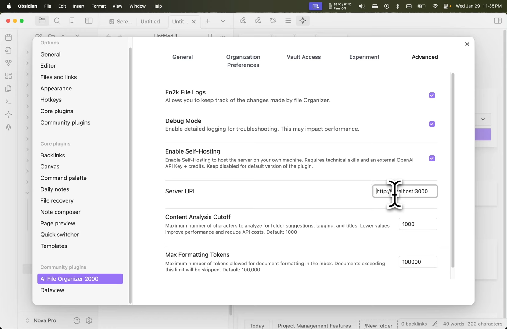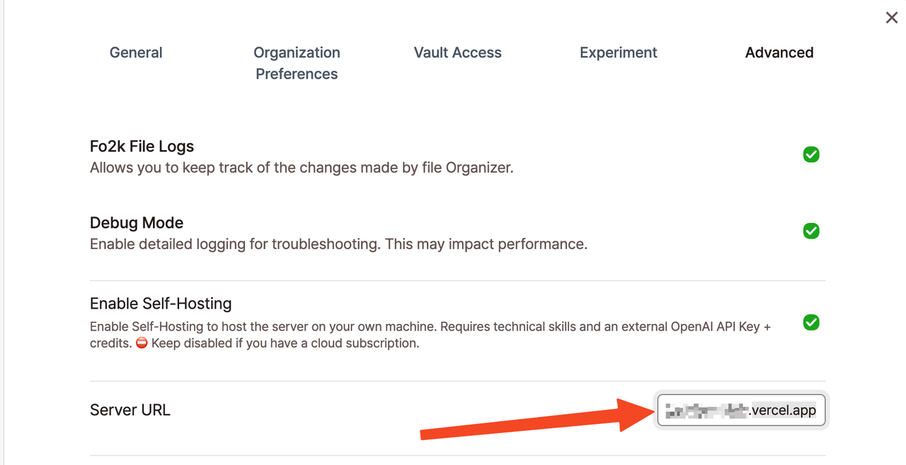 옵시디언 플러그인 설정에서 Server URL을 본인의 Vercel 도메인으로 업데이트합니다.