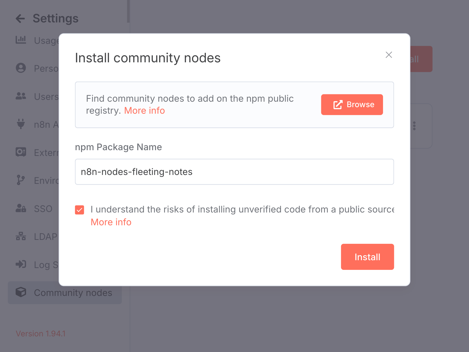n8n 인스턴스에서 Settings > Community Nodes 이동